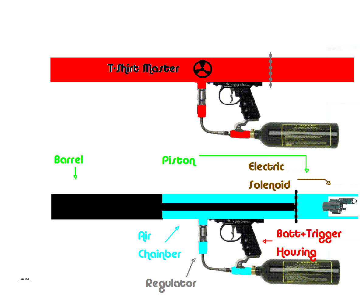 Very simple gun specifically for the rubber chicken. Use the same pipe for the chamber and the barrel. This works pretty well for large bore guns.