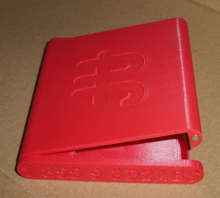 2) a business card holder made of two parts with a magnetic lock. In order to give an idea of pricing, this would be in the region of $150 - obviously too much to actually use the printer for manufacturing, but reasonable for one-off prototyping. The material is ABSplus, quite hardwearing stuff and available in a range of colours.