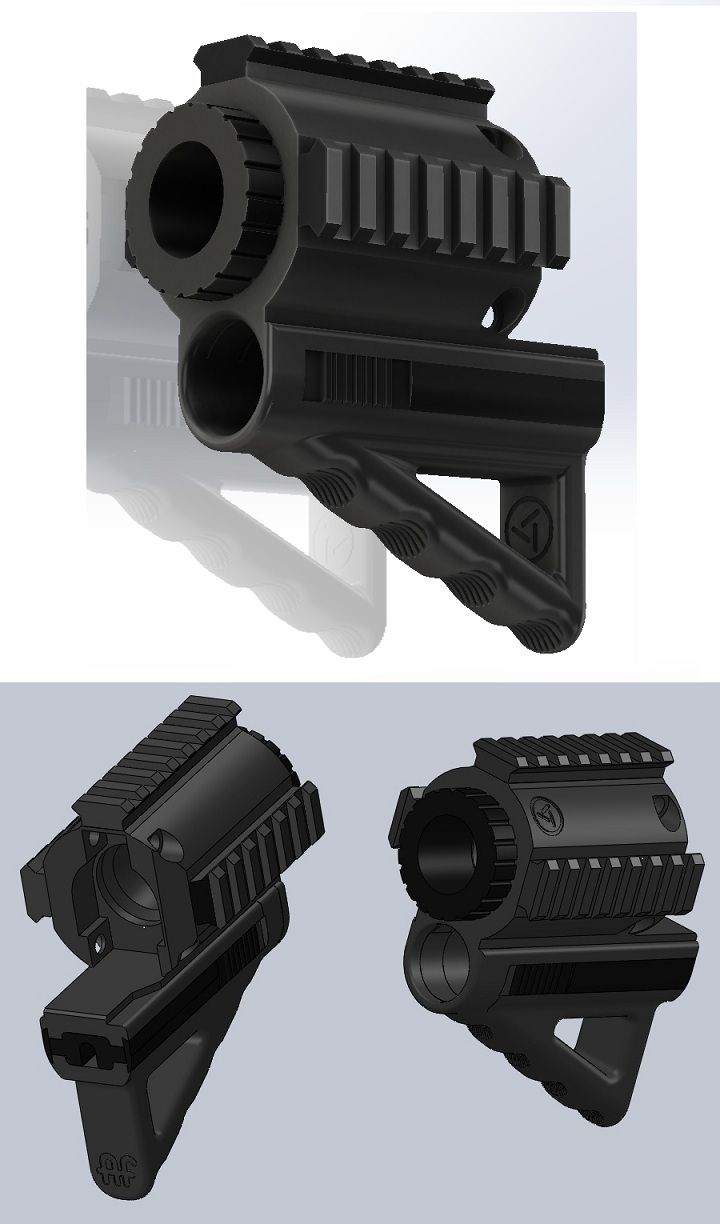 1) a foregrip with rails and flashlight holder for a Phenom paintball marker which LeMaudit designed from scratch using solidworks, made up of multiple interlocking parts