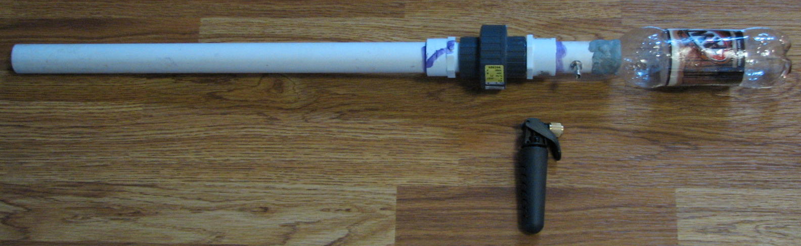 I made this gun because I was bored and had most of the parts lying around. I trigger it with a 12g CO2 tire inflater. The whole gun cost under $5 all i had to buy was the union and the 1" male adapters. Right now I am using 5 layers of aluminum foil as my burst disk. They generally burst around 65 psi. Don't get onto me for using a soda bottle as a chamber. I just used it because it was available . They can hold 125 psi, and I only go to 65 psi.