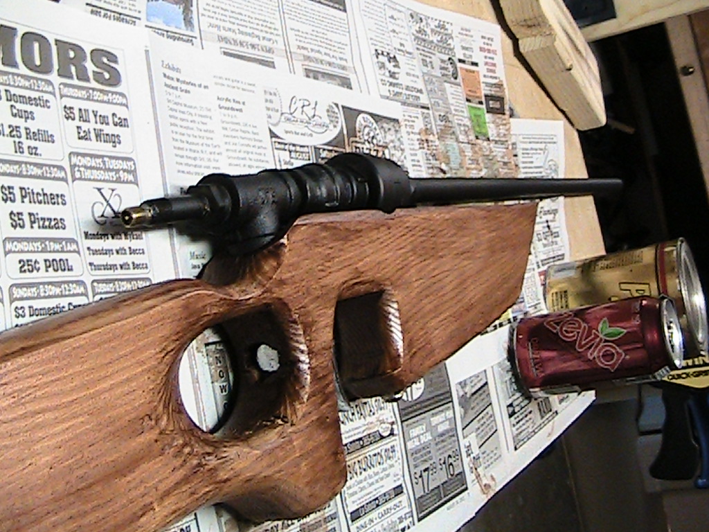 i was planning to but it looked far too ugly. with no sights i can hit a 3X3 target at 25m so i think im gooddanielrowell wrote:Very nice gun. Congrats! I wish I had a workshop and tools like yours to work with. As opposed to the other posts, I like the beefy stock, especially since you could loop the air tank into the new hand grip to give it more air volume if you wanted to.