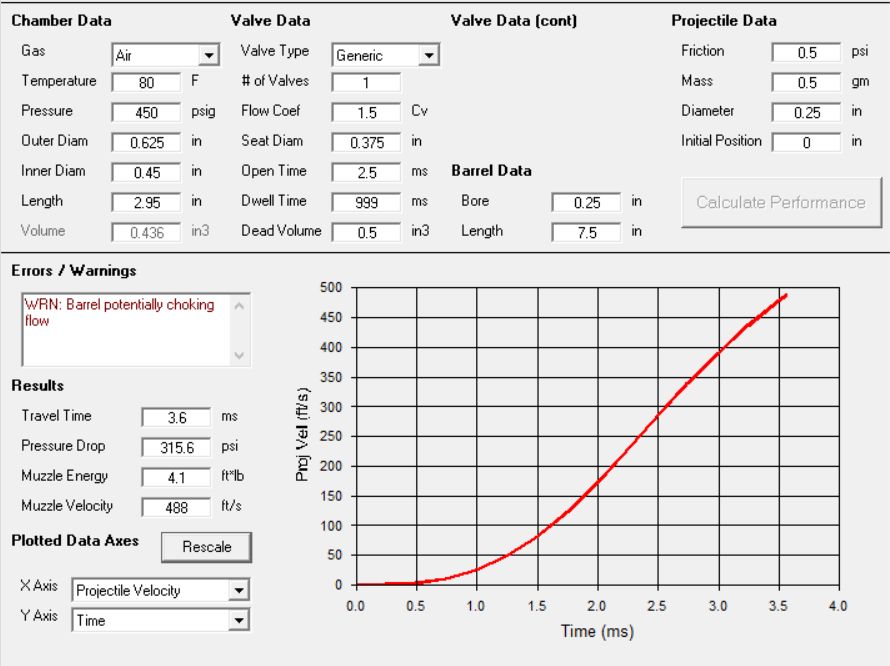 If for example I keep all parameters equal but increase barrel length to 10 inches, I get 9 ft-lbs of energy, double of the current configuration.