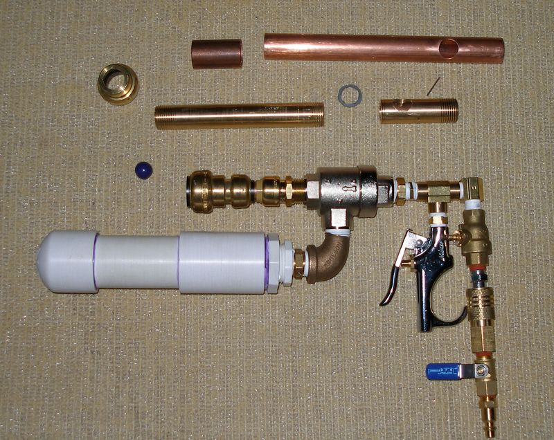 The second pic shows all the parts ready for assembly. The "roll back preventer" is a stainless pin located behind the load port. The "roll forward" preventer is a rubber washer made to exacting specs to lodge between the two inner barrel pieces and obstruct the passage of the ammo until the pressure rises a couple of psi above 1 bar. A sharkbite end cap with a big hole bored in the end holds the inside parts inside the barrel sleeve.