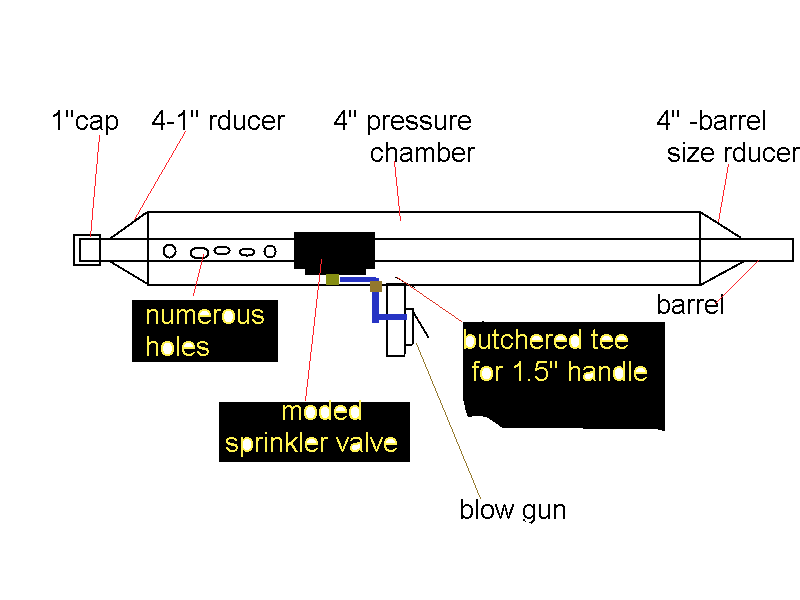 Hi all, I've been a combustion fan for 5 years and have recenly built my 1st air powered cannon. Dwv was about all I could find. The dwv pipe is rated well within my limits @ 260 & 370 psi. Are the fittings the the supposed problem? They looked pretty dang sturdy to me. Also I'd like some feedback about a diagram I'm working on. My goal is to run the barrel down the middle of the 4" pressure chamber and use the valve internally. Anyone have a reason this won't work? You would have to modify the 2 bell reducers to allow the pipe to pass completely through them. I think it will be well worth the trouble. It would allow for a short powerful sleek gun, with only one obvious chamber.