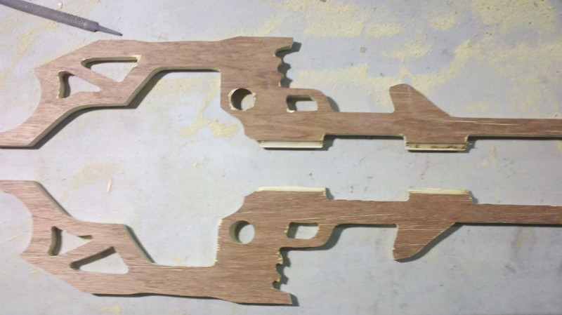 Here is the stock (so far). It consists of two layers of 10 ply oak laminate 3/4 inch plywood joined together. The barrel chanel was made by routing each panel separately then joining them together. The stock will be very lightly stained, then varnished. The tank will be powder coated black and the barrel will be anodized black. There will be various scope mounts, barrel brackets and the like that will be machined aluminum, anodized black. I have tested the system up to 600 psi. I would like to run 800 psi through it. We shall see!