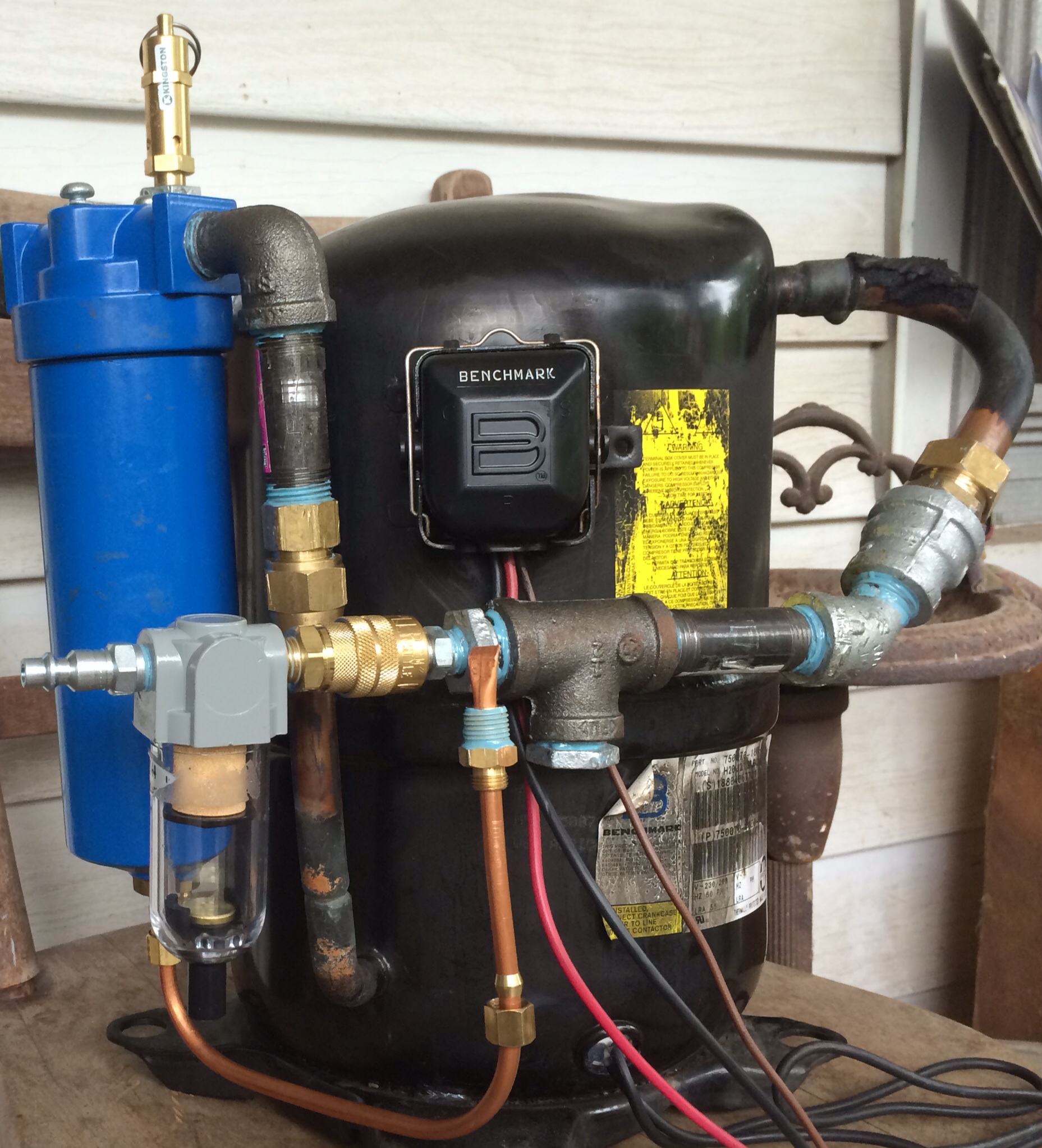Well, I did a test at 80 psi on my pick nick table and it only slid back about two feet. The truss is welded steel and weighs at least a hundred pounds. I decided to just fire it(from a safe distance) and see how much it moved and if restraint was neccecary. It dosen't seem to move much at all, all together it does weigh at least 200 pounds though. My air pressure source is a central ac compressor pictured below. It only take about a minute per fill with 120 psi going into the compressor. Works great, but does require a 220 circuit(not exactly readily available in the us). The blue housing on the output is a oil filter, the copper line goes to the tee on the inlet. It's crimped to allow a little flow through so the oil filtered out gets sucked back into the compressor. The filter on the inlet is a plain water separator to keep water out of the oil. I don't have a picture of the piston, will get one, the cannon is semi permanently set up at my friends house 20 minutes south of town.