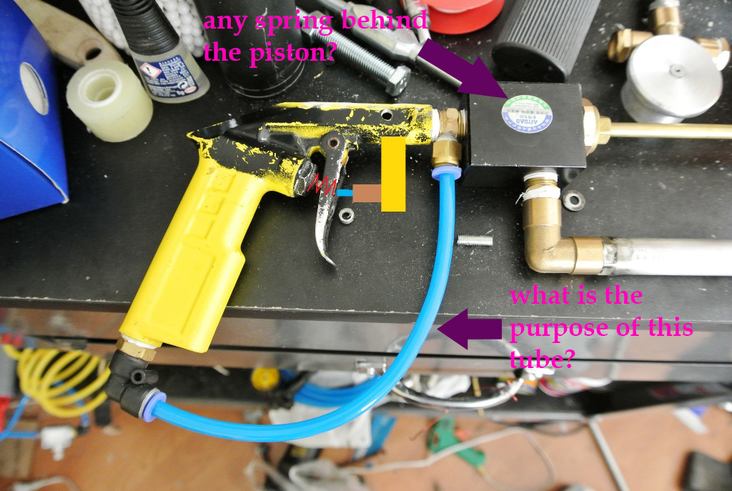 To actuate or trigger a QEV you need to release air from the P port, that pipe is connected to the P port and dumps air through the blow gun from the bottom upwards, For a single shot (dumps all chamber at once) the output of the blowgun could be blocked where it joins the T to the QEV and a small bleed hole drilled to release that pilot air when the trigger is pulled, that's how I would do it. In the first picture there is a schrader valve on the P port side, if that is the fill valve then no spring would be needed in the QEV, that is how they are designed to be used.