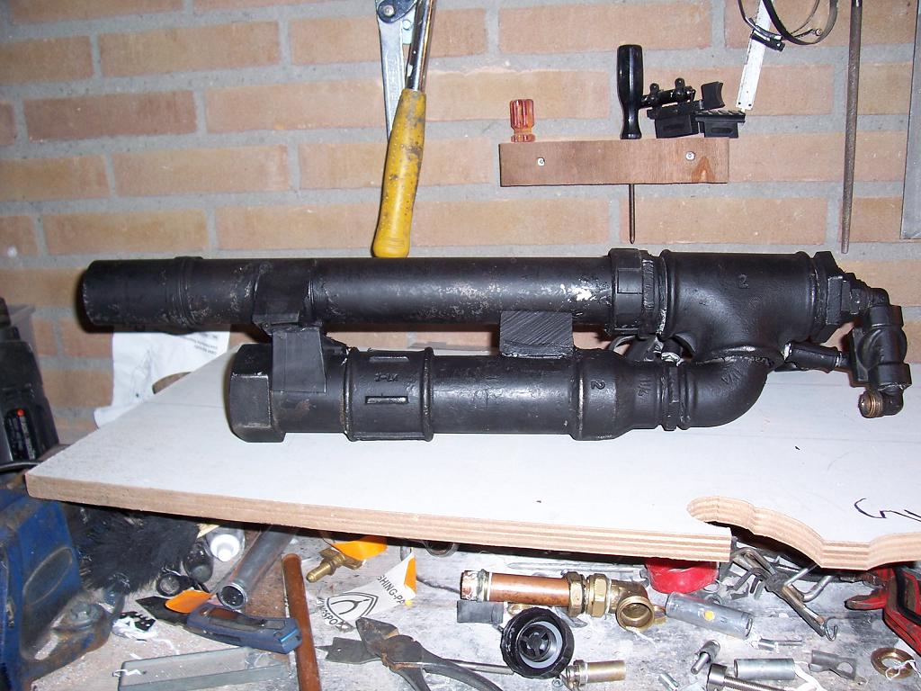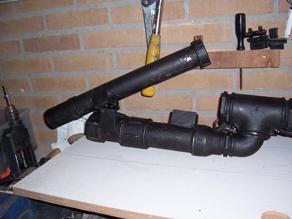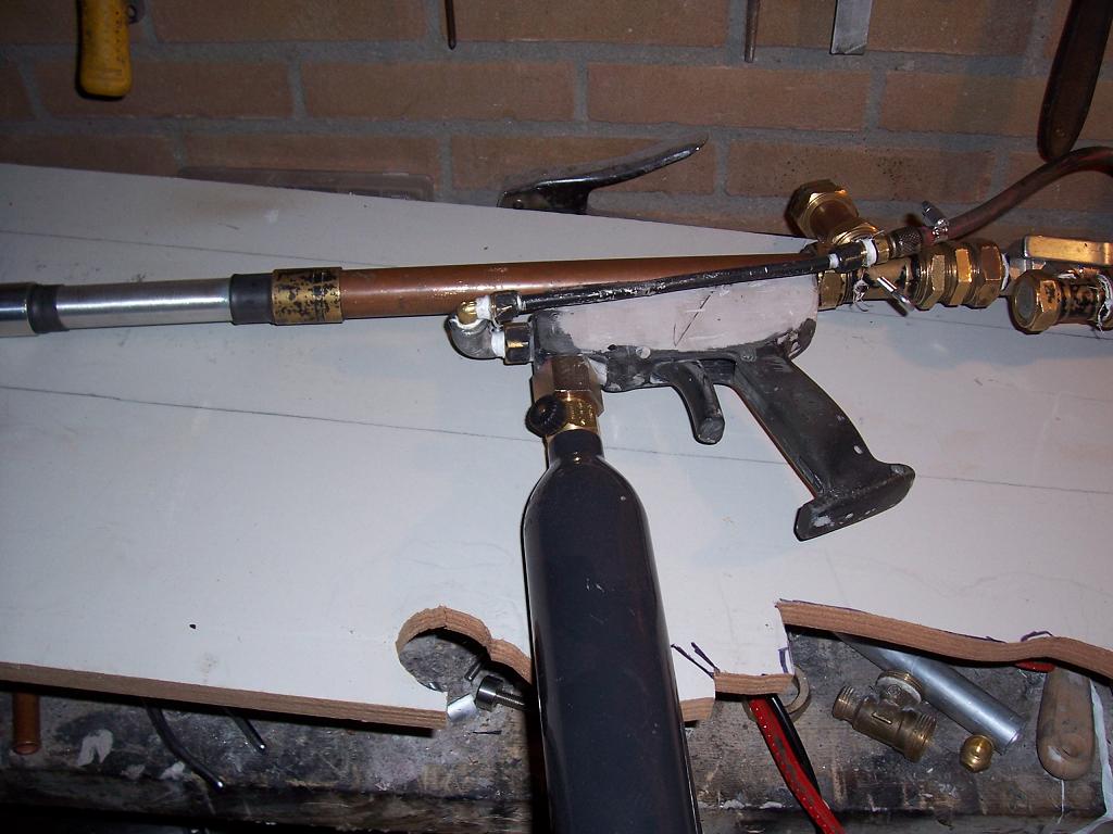 I reconfigured the gun to be more bullpup like, so without chopping the barrel, the gun is now much shorter.I used brackets to hold the barrel to the blowgun.glue kept coming loose wich in hindsight is a god thing because I would not have been able to change it.