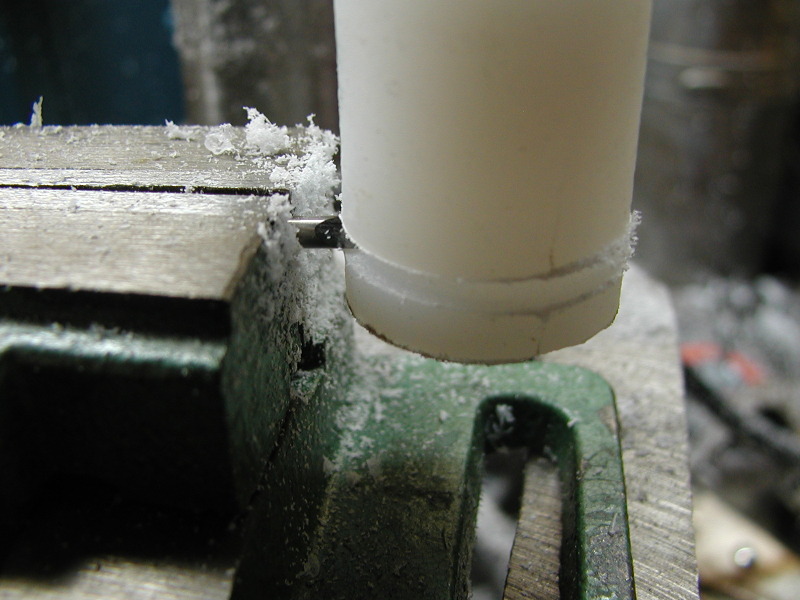 To cut the groove, a sideways cut needs done. A drill press vise works great to hold a small cutting tool that can be used to cut into the side of the piston.