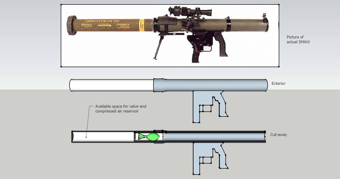 The thought of having that much firepower made me want to be our squad's AT gunner, so I began to hatch ideas for one and thought about the SMAW launcher. I have a significant portion thought up, but I am having a hard time coming up with an idea to connect the trigger to the valve in the removable rocket casing in an effective way. I plan to use 4" belled end pvc pipe for the outer body, and 3" belled end pvc pipe for the chamber and barrel. I want to be able to attach the rocket shell and fire without having to fumble with connecting anything on the inside of it.