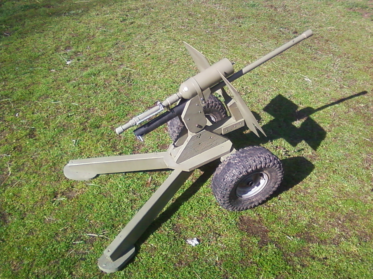It started out as just the hammer valve and air tank, with no particular design intended. I was thinking about using it to make a shoulder mounted RPG type thing, but then I figured it might be more fun and more fair to build it into a heavy artillery weapon. And darned if it isn't just that!!! :shock: I test fired it at %40 of the planned air pressure with a shotgun style sabot with around 25-50 BBs in it. Ended up with a six foot BB blast that went about 60 feet. Not massive range, but that's not the intent. At the full power (planned 100 PSI), it should be firing around 100-150 feet with a much bigger spread. Perfect for war games. :D