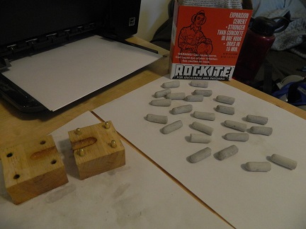 I little description of my ammo... For the cement bullets I used "Rocktite", this stuff with a creepy picture of a man. It's a mixture of gypsum and Portland cement. I cast them using a wooden mold I made. The wax I used for dipping is beeswax. As for the darts, I used that paper packing tape that's like masking tape, but stronger. I think that shooting these off in the woods won't have as much an impact on my environment as lead would.