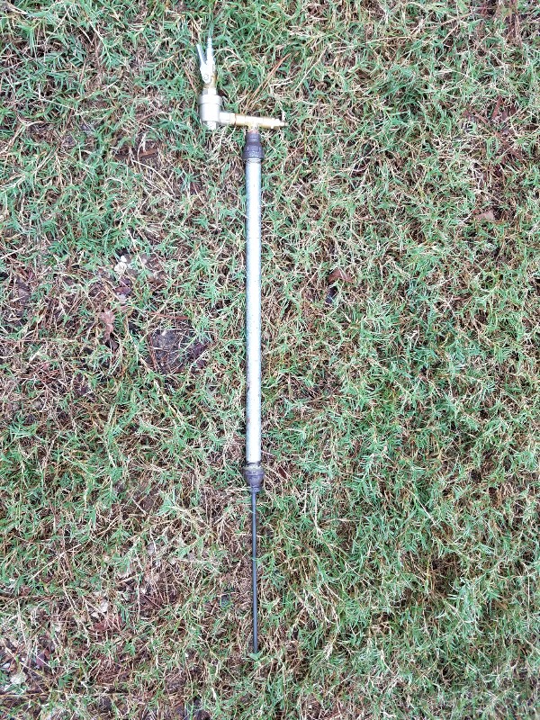 The barrel is 1/4 steel brake line bought from an auto parts store, which is the perfect diameter for BB's. The body and chamber is 1/2 inch steel pipe. I used two rubber stoppers glued together for the piston which fits perfectly in the pipe. Originally I exhausted and filled from a 1/4 inch ball valve, but I had this qev around not doing anything so I added that as my exhaust valve. For ammo I'm using bbs and some homemade darts out of qtips and the ends of nails tapped together. I strapped the gun yo an old crutch for a stock and it works quite well