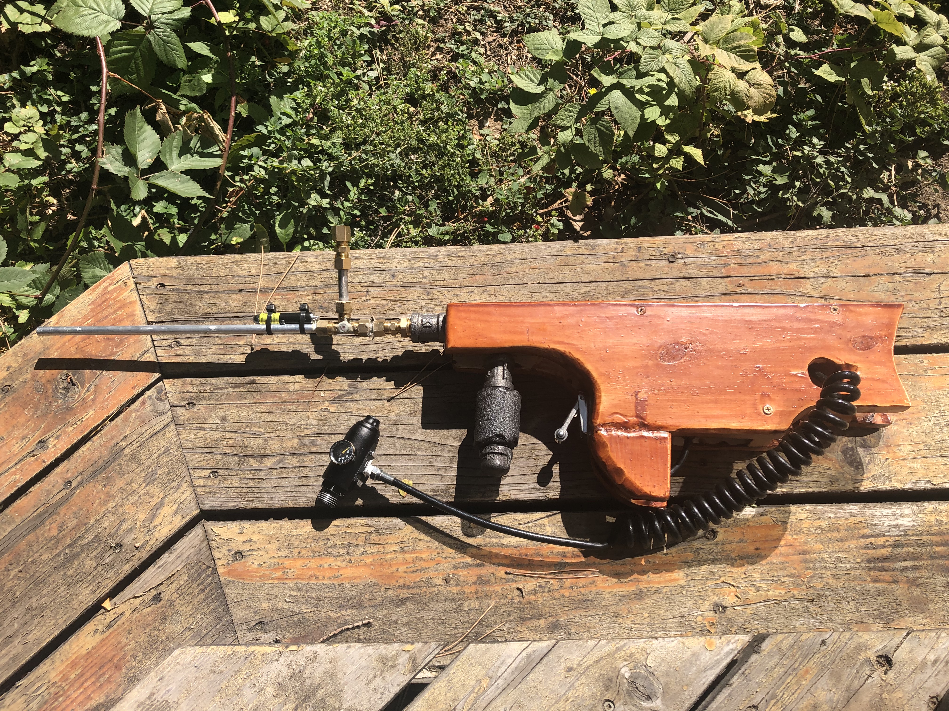 I also got another picture showing the completed cannon with all accessories. This gun continues to be an absolute blast to shoot, and gets fairly good gas efficiency. I get around 50 shots from a tank filled to 100 bar (1450.38 psi).
