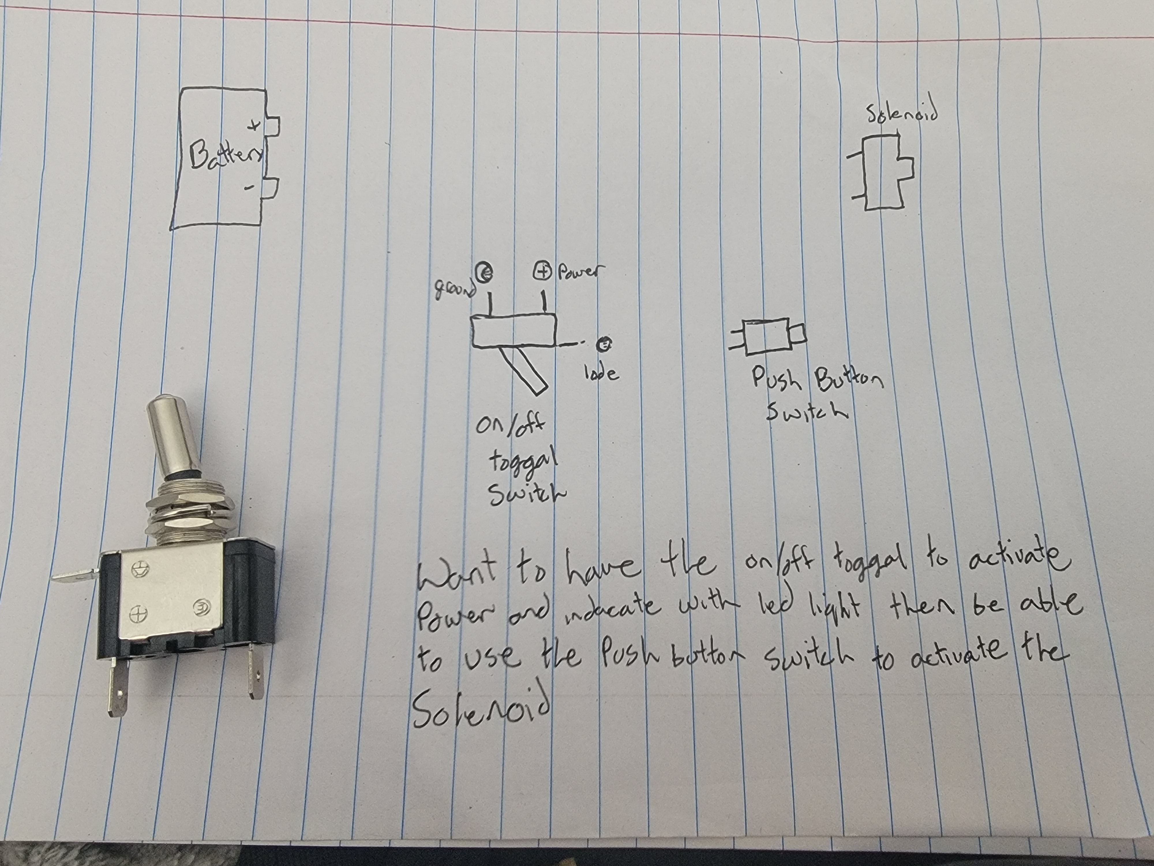 Battery positive to the off terminal of the toggle switch>Attach positive of LED and one lead of push button switch to the on terminal of toggle switch>Attach the other lead of the push button switch to the positive of the solenoid then the ground of the solenoid to the ground of the battery to complete the circuit. The push button switch isolates the solenoid switch from the LED side of the circuit from triggering the solenoid when you switch the toggle switch on.