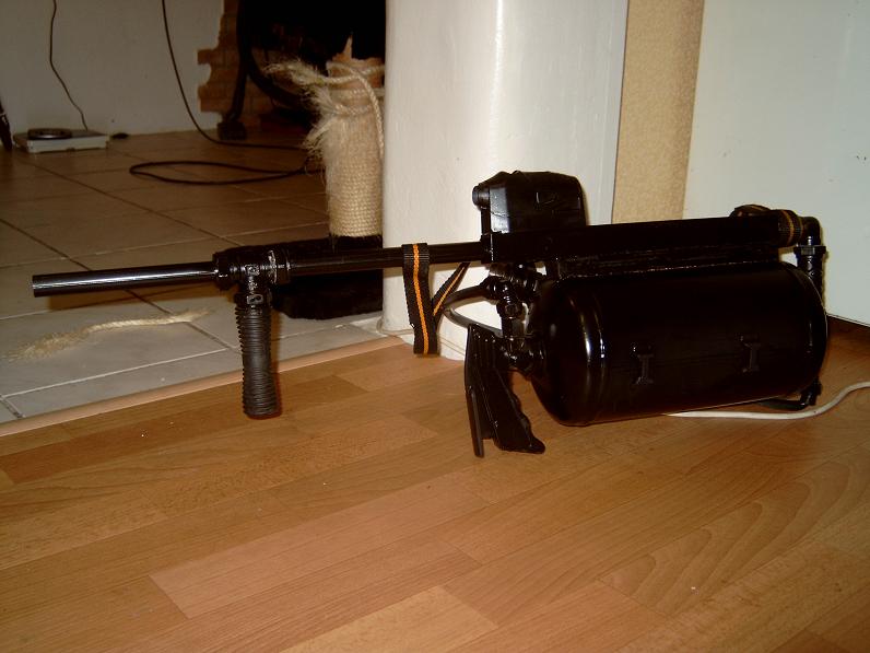 very nice design. i really like how you used a fire extinguisher valve as your trigger. thats something very few people do. im tempted to use a fire extinguisher on a friend of mine to use up the CO2 just to get to the valve, as well as the metal tank as a resevoir. what is your estimated range with this puppy? and also do you have any idea as to the speed of the marbels when they fly out of the barrel?