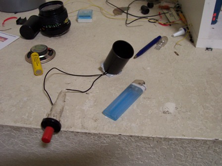 Since I had some film containers in my room, I decided to give it a try but with a different approach. I put the wires through the container instead of the lid so I could fire the lid off. The ignitor is the piezo grill ignitor from my Econogun and I used a butane lighter for fuel.