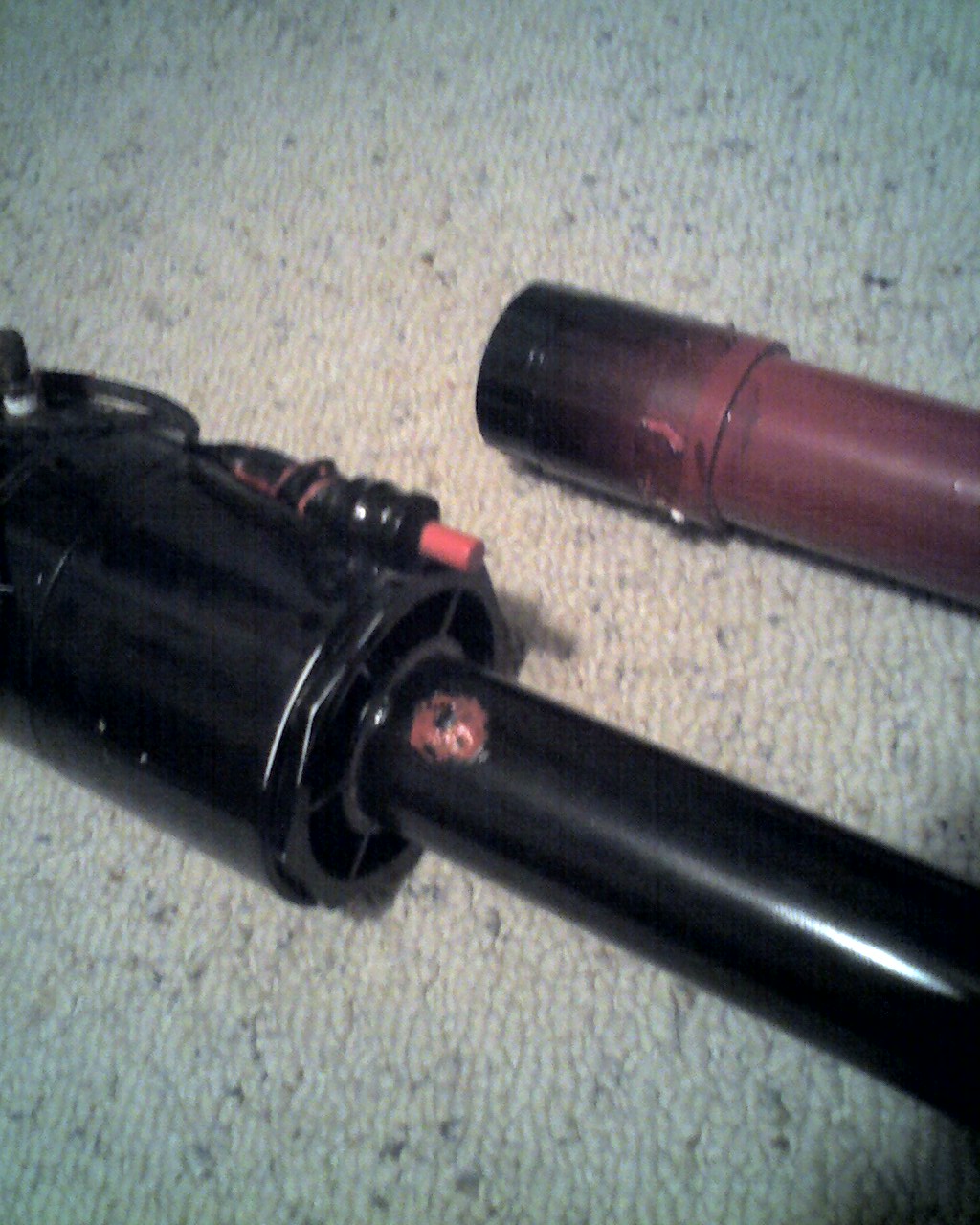 This was my first cannon ever built, and it used a ghetto shrader propane meter. Only God knows where that is now. The chamber is 12" of 4" pvc, and 36-40" of 2" barrel. Piezo ignition, and the shoddy barrel knife helped with shooting spuds. Fun to learn on, but not quite a showpiece.