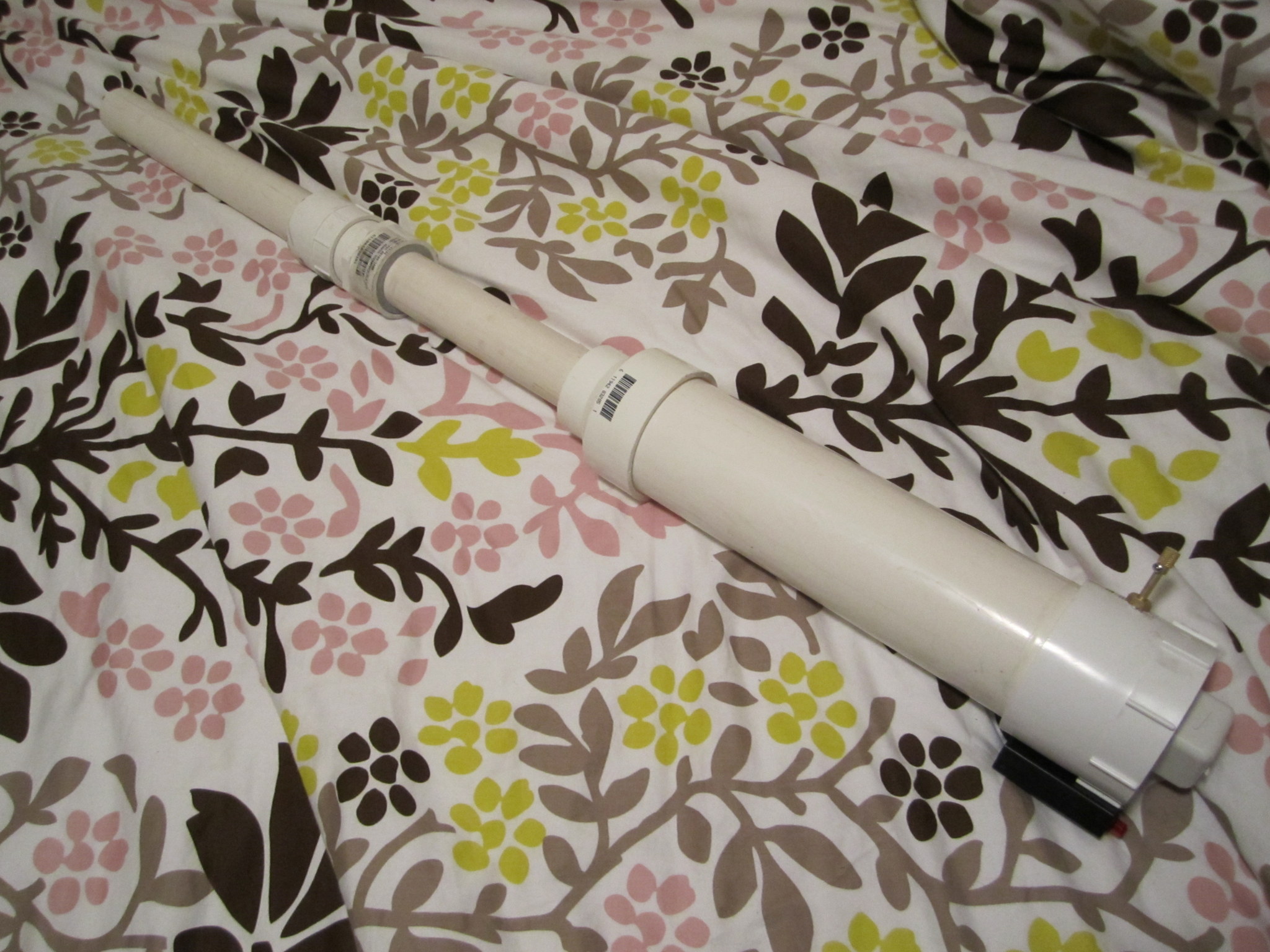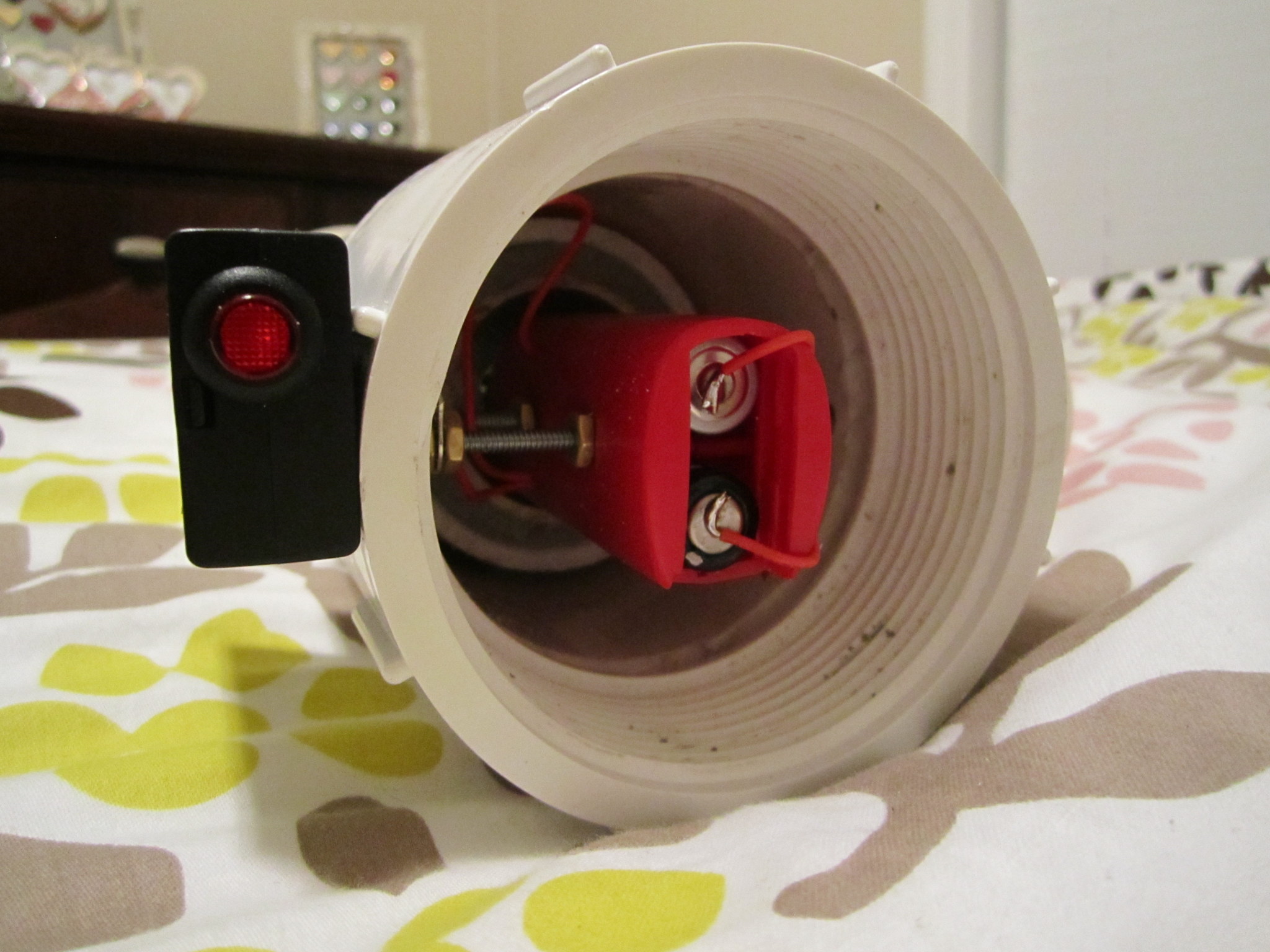 Right before I took these pictures one of the fan blades fell off. I designed it to where the fan would fold up and stick into the back of the barrel, but one of the blades likes to come off if it's done roughly. I also rigged the wire at the back up because the back cover is a little too tight and is scratching the insulation off the back of one of the batteries, and then pressing the negative side and the uncovered positive "terminal".