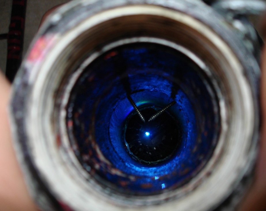 Here's a pic of the silencer. It is made from the left-overs from making the chamber and barrel. The inner 1.5'' piece has about 100 1/8 holes drilled in it. The 3'' piece is filled with cotton to absorb the sound and slow the gasses. The whole silencer slides about 5'' down the barrel, and it meets the inner silencer barrel at a modified coupling (to accomodate the slant of the barrel).