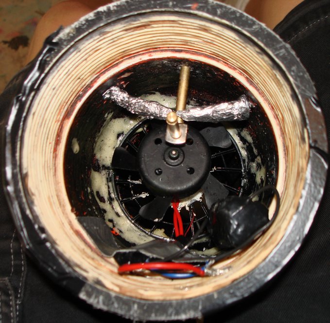 Here you cas see the inside of the chamber from the front. You can see the front contact, the color-changing LED, and the fan