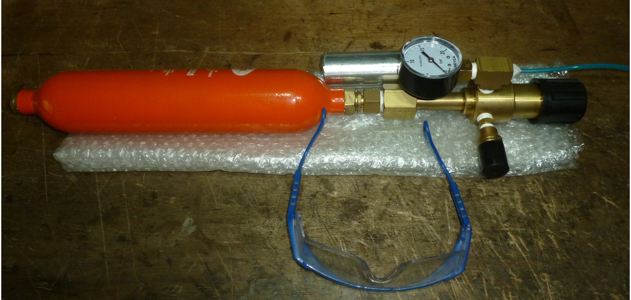 The compressed air tank in a 500 cm3 CO2 cylinder, which is filled with air up to 70 bar, and the pressure regulator that decreases to 6 bar, is a bit large but works excellent. I can regulate from zero to 15 bar with good precision. The idea is to put a strap and it goes behind me, on my back, to be able to make the weapon portable. The butane reservoir is that shiny tube of color which is a modified perfume spray.