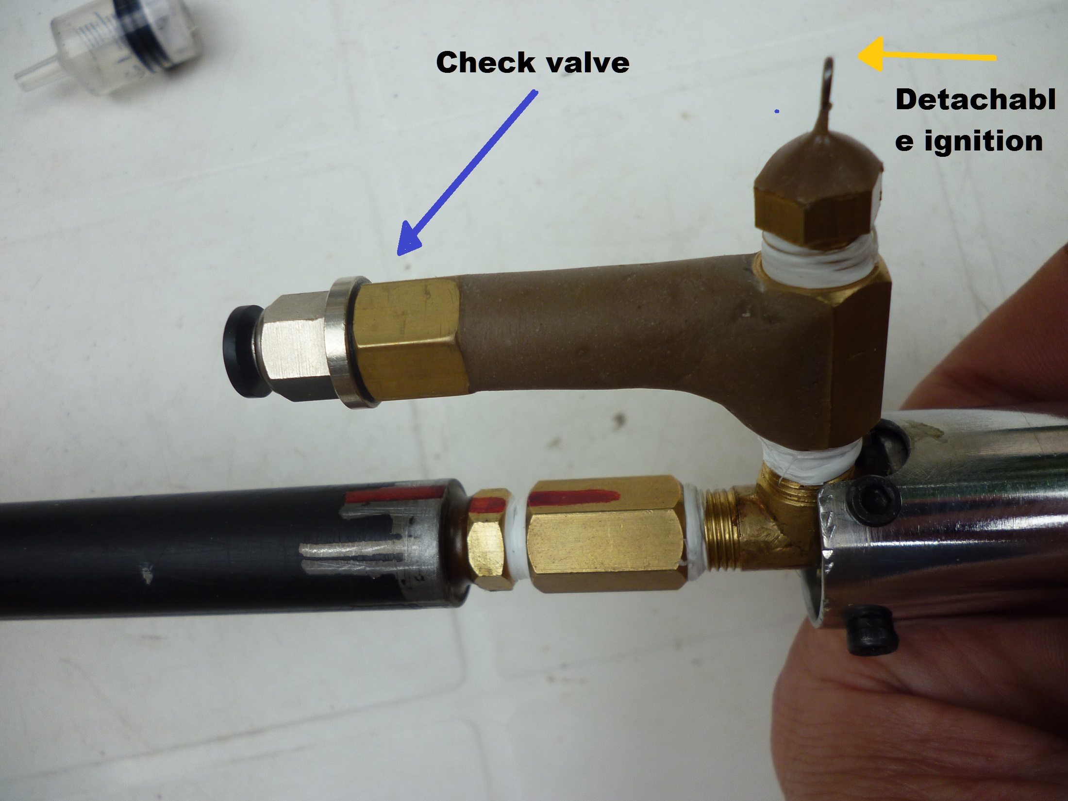 The construction is cleaner and seems to me a better idea than the other version, because in this new idea, the barrel has no limitations in terms of length, and the size of the doser is not a problem. I have added a check valve for the hybrid to suck the mixture. The retention at o´ring no longer lets air in from the barrel into the combustion chamber. Load one 40 cm3 of air.