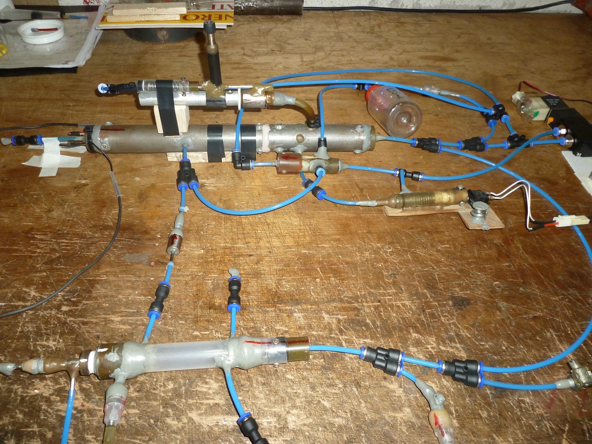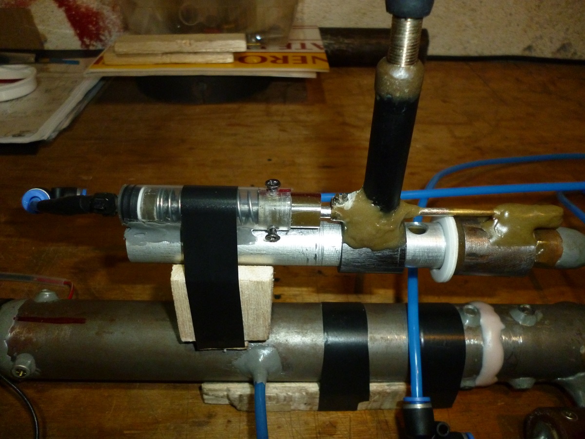 I have built for these basic tests, a pair of small combustion weapons that I have fired with a single combustion chamber, and with two combustion chambers coupled together, with a transfer hole between them of about 5 mm.