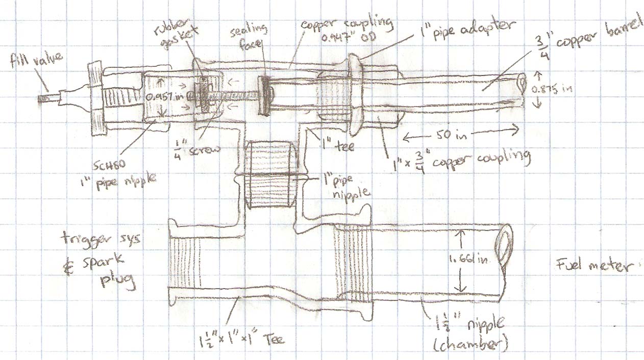 Anyhow... it's going to be made from mostly galvanized malleable iron and copper fittings for use with a 3-4x air-propane fuel mix. The piston will be sealed with an air-spring that can be pressurized for a desired burst pressure through the fill valve. Setting this up requires a simple calculation: