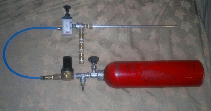 This is the project so far. The "barrel" is attached just for testing purpouses and it's still lacking stock, real barrel, and the trigger which will be instead the 3/2 DCV button.