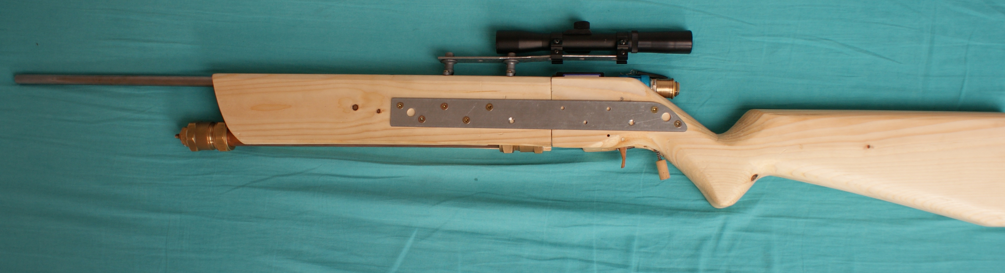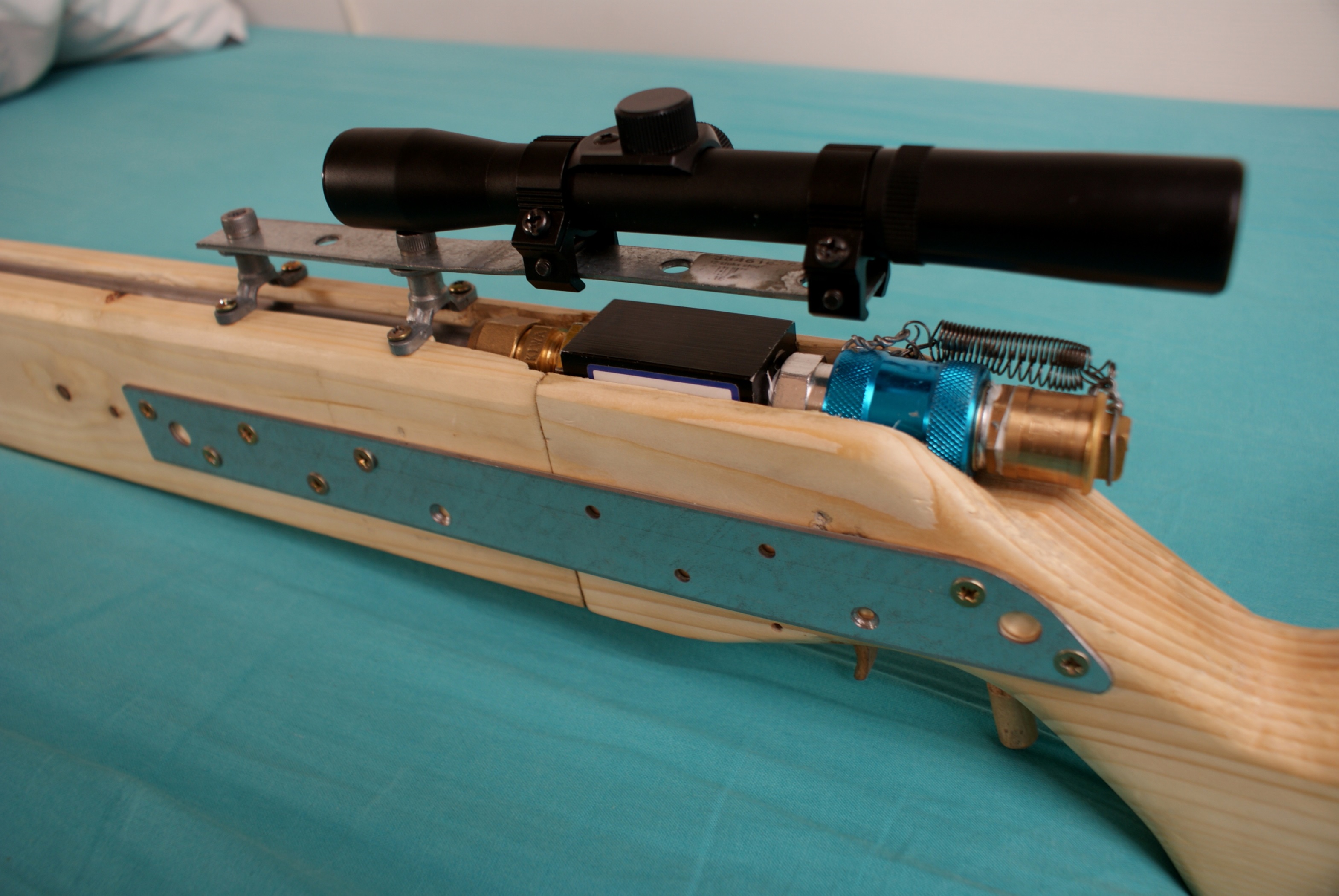 The workings are very simple, I've used a 22mm copper pipe as air tank, and a presta valve adaptor soldered into a stop at the end (see third picture). I use a bike pump to pressurize it. The 22mm connects to the A-port of the generic ebay quick exhaust valve, which I modified to allow this. I used a blue slider valve (also ebay) to pilot it, with some springs attached to it. The trigger mechanism is all wood, but it works reliably.