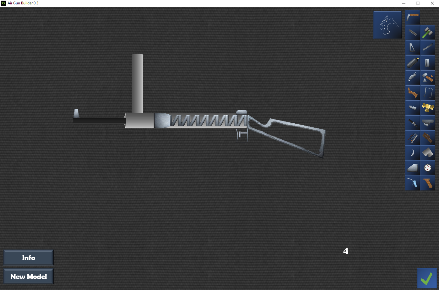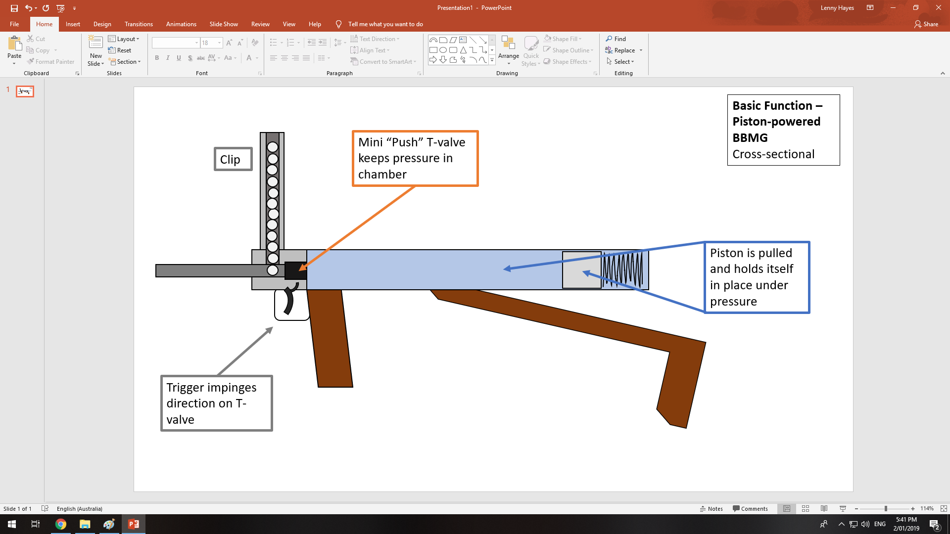 So here's what I've come up with, instead of using a short, narrow piston to fire off a single pellet, what about a long, wide piston (like 40-50cm) with a powerful spring drawn to the rear to create the power supply for a BBMG?