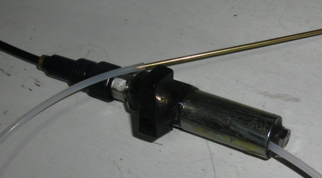 A previous prototype on this principle jammed up, on account of the tube I was using between the valve and the barrel being of 2mm I/D - exactly double that of my projectiles, which is asking for trouble. The one I'm using now is 1.5mm I/D which is perfect - small enough for the blow of BBs not to jam, but large enough to allow enough blowby to shoot past the projectiles in the tube.