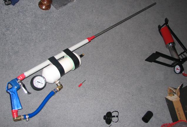 This is my Pneumatic BB Sniper, it fires various things, such as my favorite, a sharp pop rivet wrapped in tape, or split sinkers wrapped in tape, 2 BB's wrapped in tape, theres lots of things i fire. The Gun is basically a Blow gun, Attached to a 2" Chamber With End caps (all pressure rated) With tire valve popped in, PSI gauge attached, and a 90 degree brass elbow leading away towards the blow gun, and attached to the blow gun is another 90 degree elbow, both attached together using pressure rated pipe and nipples, and other bit and pieces.