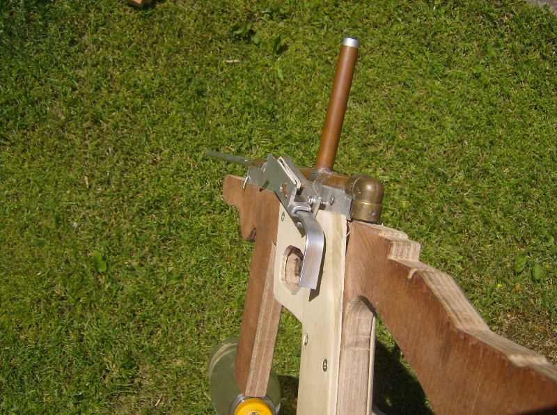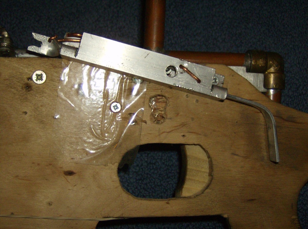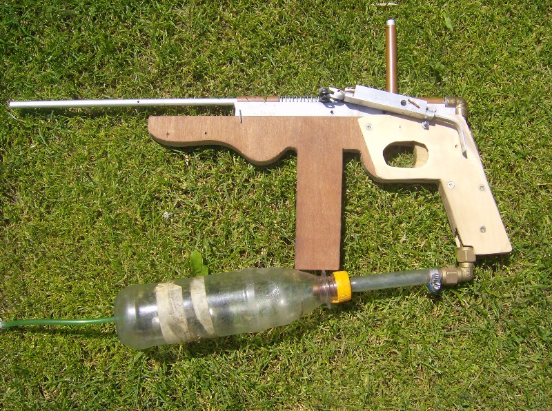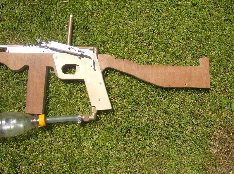 This homemade gun shoots 0.12gram bb balls at around 280miles/h. (450km/h) It works on a 1.5 liter coke bottle at 5bar operating pressure. It can shoot about 40 times on this bottle. It also has a gravity fed magazine. I also have a system to make sure that the balls dont roll out of the barrel and that there are no double feeds. At the moment I am working on a automatic airsoft gun which recocks on the pressure of the bottle as well; just like an uzi. So inother words this gun still needs to be recocked manually.