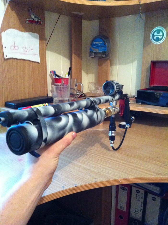 The scope I just whipped up using some $3 binoculars from a $2 shop down the road. It works surprisingly well actually. Though I want to buy a nice red dot sight off deal extreme, dont know if it would get through customs though..