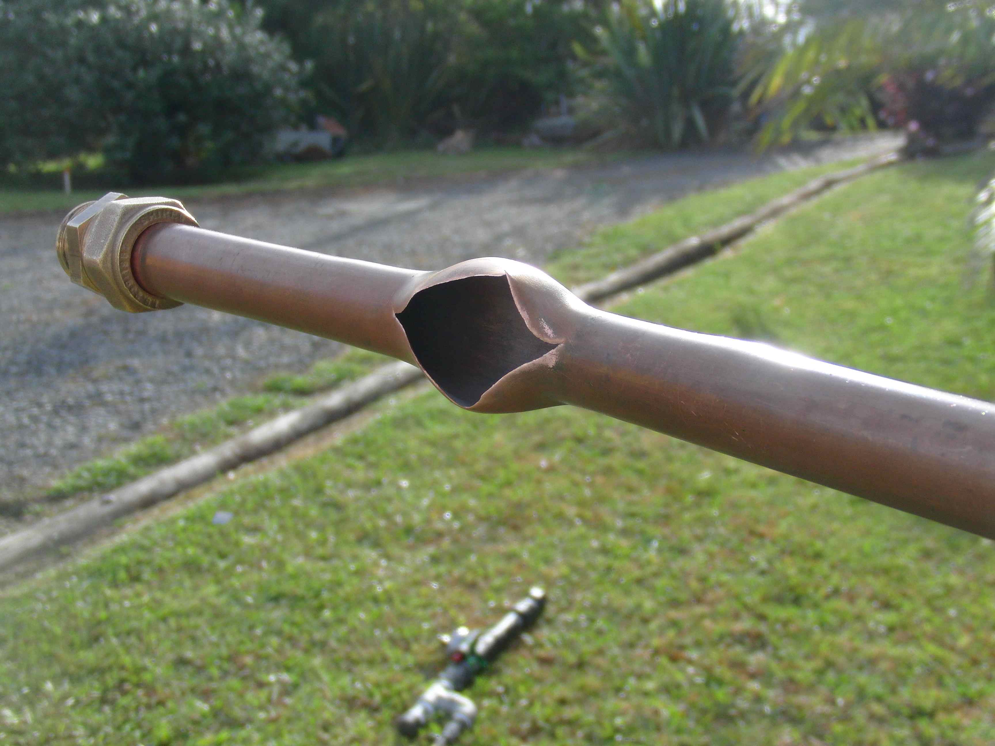 Remember that tiny bulge I found near the breach of my copper barrel? Yeah, it got a little bigger. So, are we calling this DDT or just the consequence of using copper tubing at pressures above what they're intended for? The projectile for the shot in question at a 10x mix was a 42g fishing sinker with a loose-ish fit in the barrel so had a foam sabot accompanying it.