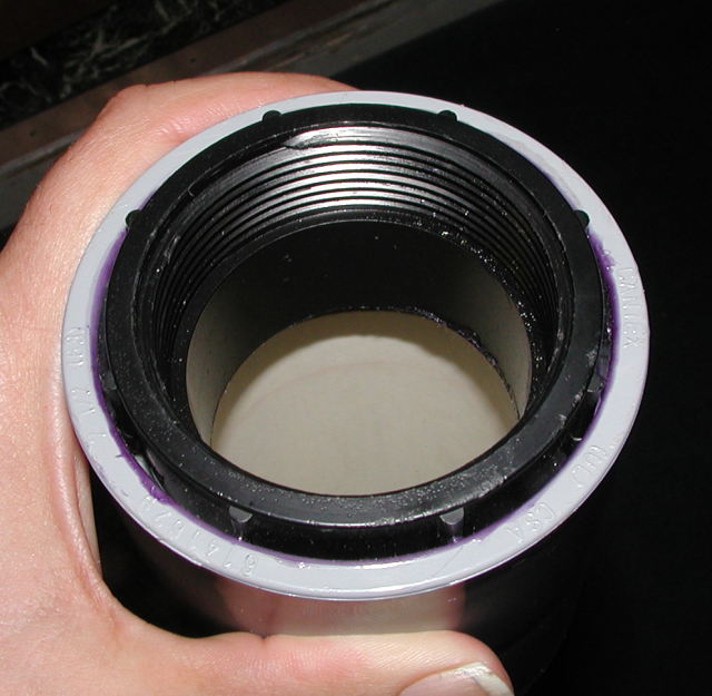 The barrel has a 2.5 inch coupler with a 2 inch ABS female ABS adapter inside a modified coupler. This permitted recessing the cleanout for additional strength. The 2 inch threaded is the standard used for the larger launcher for it's 2 inch threaded outlet. A cement made for ABS/PVC was used to join them.
