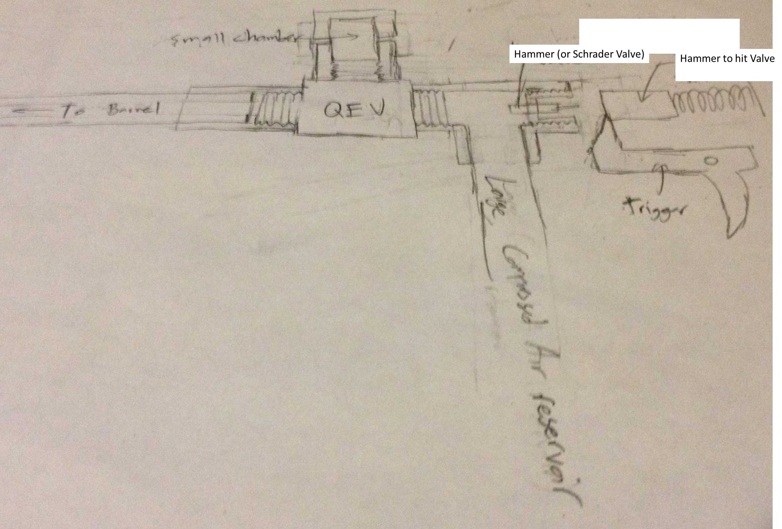 I have the pressurized air reservoir and shrader valve on the "In" port of the QEV, a relatively small chamber attached to the "Out" port, and the barrel attached to the "Exhaust" port.