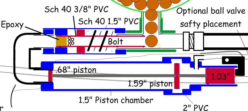 Then I found the Slider and the GB semi, both by Clide. I took design ideas from their diagrams: The Slider and The GB Semi. If you do not understand my diagram, see these forms! The Slider shot paintballs semi-auto at a high velocity, but the pilot air was wasted. The GB Semi was more efficient, with no waste, and shot golf balls semi/auto. By scaling the GB Semi down, I came up with these plans.
