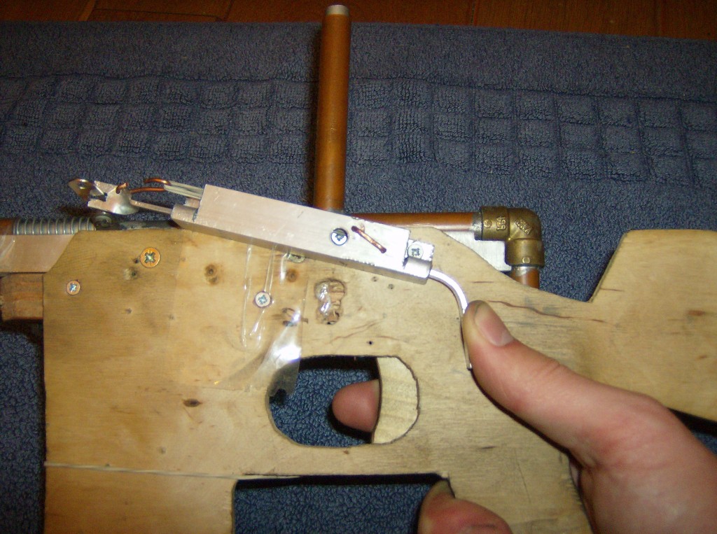This homemade gun shoots 0.12gram bb balls at around 280miles/h. (450km/h) It works on a 1.5 liter coke bottle at 5bar operating pressure. It can shoot about 40 times on this bottle. It also has a gravity fed magazine. I also have a system to make sure that the balls dont roll out of the barrel and that there are no double feeds. At the moment I am working on a automatic airsoft gun which recocks on the pressure of the bottle as well; just like an uzi. So inother words this gun still needs to be recocked manually.