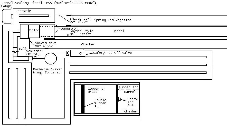 EDIT #2: Dang, well, just looking at this a little while after wards, I think I screwed up. Even if the pop off for the pistol where to work, (still no confirmation on that front) it would fill at the same time I shot, not giving any time for the valve to seal again for the next shot. So, I guess I just made a paintball sub machine gun. Not necesarily a bad thing, (I'll probably end up making something like it, but bigger, later on) just not what we were looking for. So, If anyone else has some ideas of a more delayed fill valve, that would be great. Just examine the pistol's diagram for an idea of what it'll look like. Thanks alot!