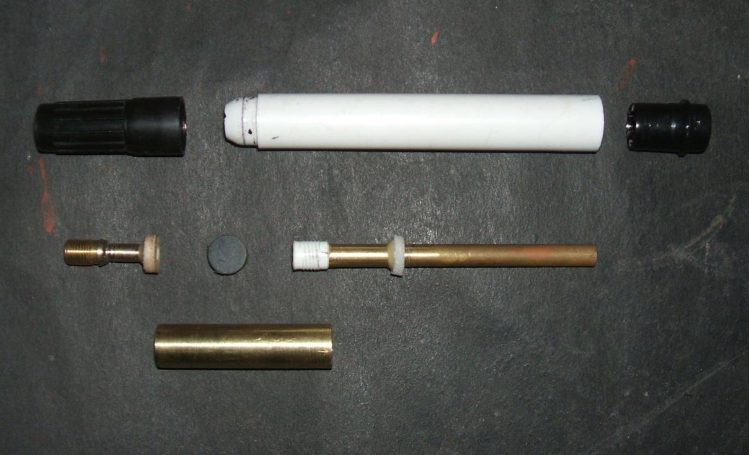 Here's the parts before it all gets epoxied up. One thing to note is that since it will not be servicable, I've added a plastic collar to the barrel to widen the piston seat and reduce stress on the piston.