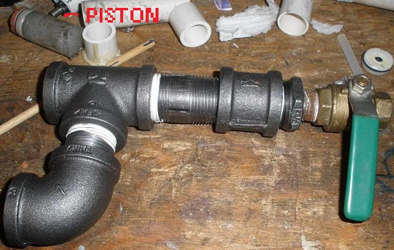 I made this earlier today. It is made of black iron pipe. I believe the pipe is rated to 1000psi (correct me if i'm mistaken). I'm wondering if you guys thing it will work and hold up to the pressure. In the image i attached the piston is in the top-left hand corner. It is made of hot glue and some sheet rubber. Do you think the piston will handle the pressure well? I plan on running this at 600-800psi. It will have a 2"x12" chamber and a .5" barrel for marbles or darts. I've been looking around at the pressure its rated to and in dissapointment i'm finding that my pipe is only rated to 150psi...