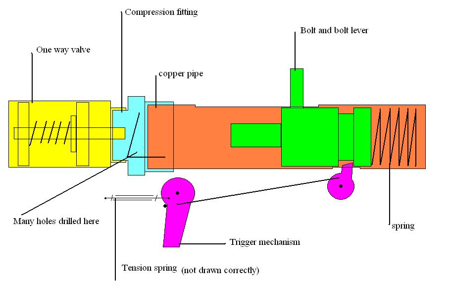 I have switched back to the one way valve and decided I will fill from the chamber side. However, I don't want to build a hammer mechanism because I don't have the tools, skills and materials to to so. I have come up with a bolt mechanism which will trigger the one way valve but I am unsure how to build it. It is quite simple.