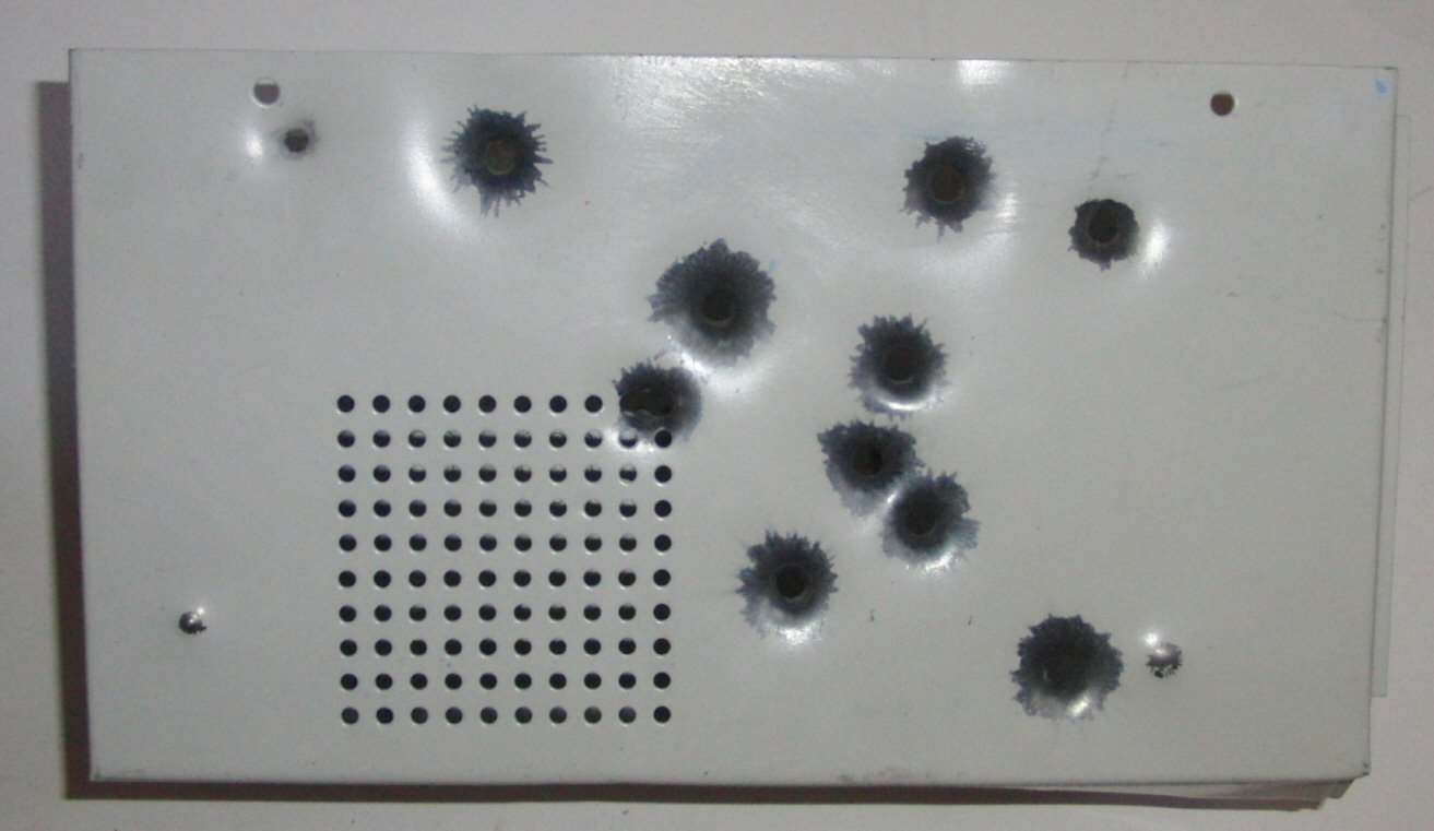 Still won't make it through 2 sheets of steel though, but given the deformation of the lead on penetrating the first sheet it's hardly surprising. I tried with a 0.177" BB in a foil sabot at 12x and it punched straight through, you can see the entry hole top left in the first photo, and the exit hole in the second.