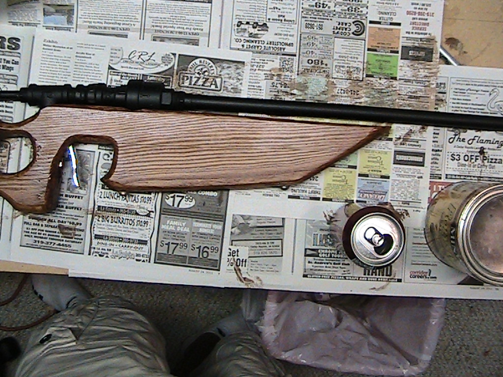 this gun was built for accuracy before power but i am very satisfied with it so far. one major mistake i made was that i built the stock before the gun so there were some problems with that. the stock is made from a 2X10 of douglas fir. the stock was first based off of a single shot .22 i owned, i then decided it needed a pistol grip so i traced an l96 pistol grip and thumbhole. i later decided that it looked kind of whimpy and also the airtank would stick out the bottom so i added a much more beefy looking front grip and secured it with t-nuts. i attached it very well and it looks like one piece of wood. the stock was hollowed out by drilling large holes and then smoothing them out with a smaller drill bit. all of the cutting was done with a skill-saw. after carving out the stock i used wood chisels to make the thumbhole more comfortable. i then used a router to smooth the edges and used a belt sander to smooth the sides more too. it was then stained with an antique walnut finish and then a coat of poly.