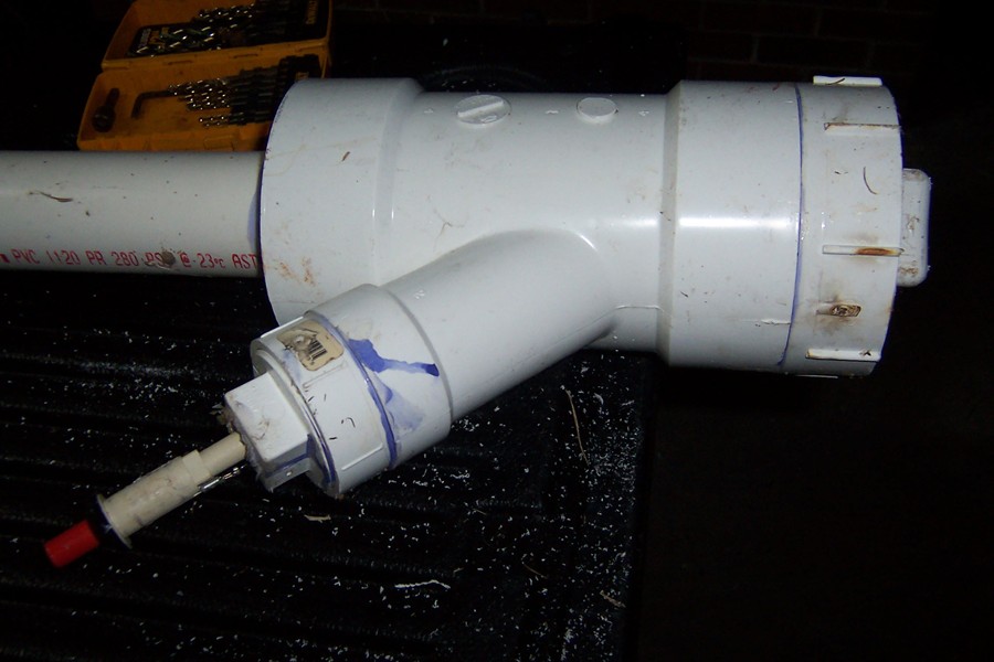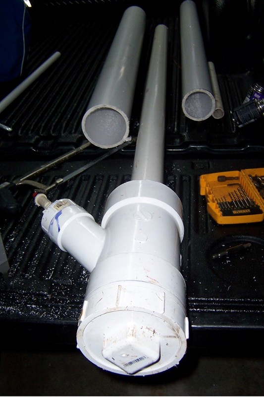 I made this gun with the standard barrel, but I conected it to a 4" to 2" flush reducer connected to the top of a 4" coupling with a 45 degree 2" cleanout. As you can see, the cleanout is a ready made handle, and a good place to put the ignitor. To place the ignitor, i just put a 2" threaded cap on the cleanout and drilled a 1/2" hole in the top. The grill ignitor fits just right, and with a little sealant, is air tight. I normally just connect the wires to the metal ignitor flange that comes with the ignitor kit, and attach it to the inside of the chamber with epoxy. After that, I used the standard 4" threaded cap to close things up. This model does not have a fan or propane injection, but can be made with about $25 and 2-3 hours of your time. One of the downsides I have noticed is that it is easy to overdo the fuel and flood the small chamber out, causing a misfire. Additionally, try to keep the threads on the back clean and dry, as I have had a few guns with jammed threads due to excess hairspray.