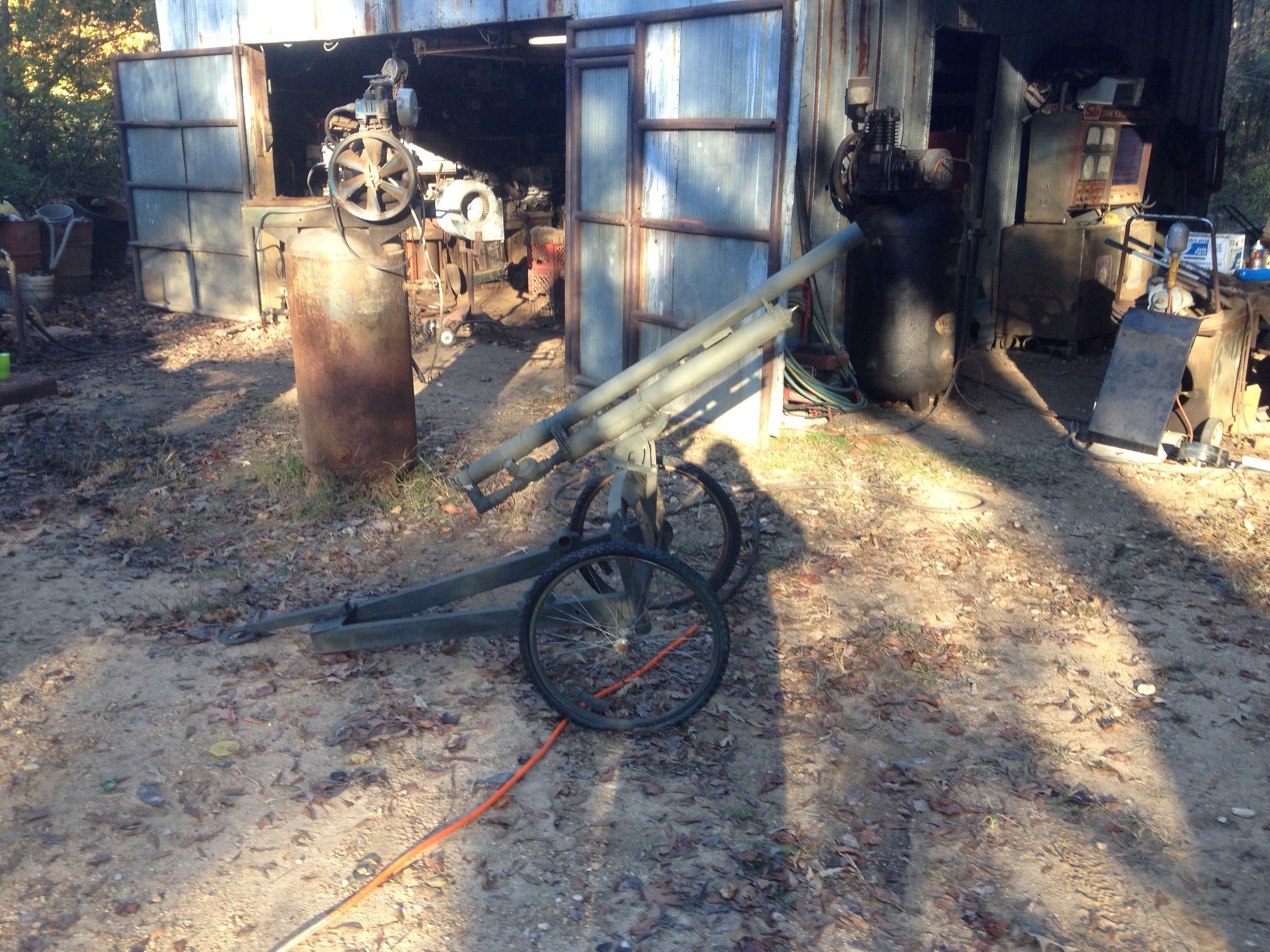 it is made out of a bicycle, treadmill, satellite dish components, a sprinkler valve, and some PVC pipe. It was mostly junk i had laying around the shop.The air tank is made out of a satellite dish post i cut it to length and welded ends on it. i put a metal valve stem on one end and a 3/4 threaded female coupling on the other and an air Gage in the middle from there i put a 3/4 inch pipe nipple then a yard sprinkler valve or solenoid valve. then another 3/4 pipe nipple to a 3/4 to 1inch reducer. from there i made a 90 degree bend out of some tubing and welded the reducer to one end and the other end to a piece of 2 inch by12 inch pipe. from there i jb welded a 2 inch PVC sleeve onto it and then added the 2 inch PVC barrel. i used the aiming part of a satellite dish to mount it to the carriage it works good because it has the degrees stamped into it. I have about $50 in it and built it in about two days. It will fire a golf ball 400-500 yards at 160 psi on a 45 degree angle and put a hole through a industrial garage door at 30 yards. let me know what you guys think.