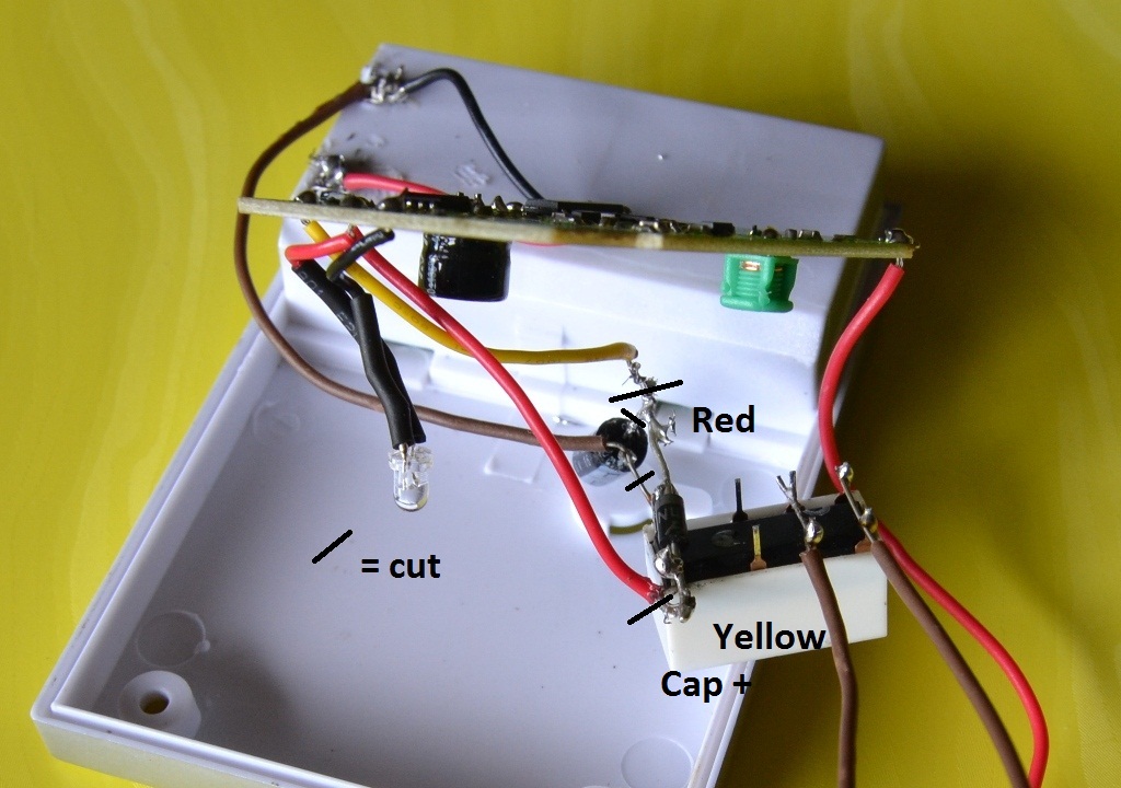 Cut the Red and Yellow wire as shown. Cut the capacitor minus lead going to diode and capacitor +. The capacitor minus should only be going to the Black lead which is ground. The capacitor + lead should go to the Yellow lead connection.